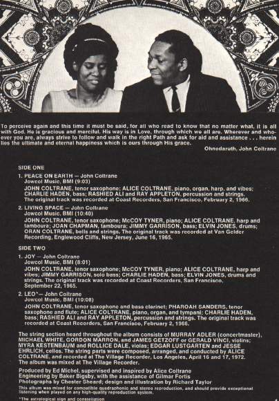 John Coltrane: tenor saxophone, bass clarinet (4); Alice Coltrane: harp (1,2,3), piano (1,4), organ (1,4), vibes (1,3), tamboura (2), tympani (4);
