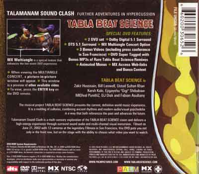 A huge advantage to the DVD is the ability to hear it mixed in Dolby Digital 5.1 or DTS 5.1, making the sound quality near-perfect. Palm obviously put a lot of time, care and production value into this DVD, and it shows. In addition to the concert itself, there are bonus features including a psychedelic video remix of "Magnetic," a making-of documentary including a press conference, and also a spoken-word piece performed by Ajay Naidu. Not only that, but stick the second disc into your computer and you'll get two bonus MP3 remixes. But beyond all this, the DVD serves a greater purpose. It thoroughly mesmerizes those that watch it, seasoned TBS fan or curious newbie. If Indian Classical music is ever to find an audience among a younger generation, it will be vehicles like this that will do it. Palm Pictures and everyone involved should be congratulated for bringing such an amazing exeperience to light and allowing people to bring it home with them.
