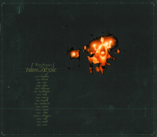Like the first volume of the series, Music Romance, Volume Two: Taboo and Exile deals with issues of lost innocence. The first of the Music Romance series had more overt references to childhood, with lengthy literary references and a title which gave it all away: Music for Children. Here the images are a little bit more subtle and a lot darker. The outer sleeve is black, with ritual objects represented in the fiery colors of orange and red. The liner notes contain a photo of poppies as well as more ritual objects, including one which seems to be bathed in blood. The front of the booklet has a photograph of a naked young girl that presents her in a way that is half sexualized, half innocent. There is just one piece of text this time, "A white room with white curtains hides the face of a sleeping child, barely a child, barely asleep, leaving nothing but an image, the sky's double, to rediscover one's innocence."
